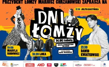 W sobotę 14 czerwca Łomża zagra w rytmie hitów. Od godz. 17:30 rozpoczną się koncerty z udziałem lokalnych i ogólnopolskich gwiazd. Scenę otworzy Julita Kaczyńska artystka z regionu, znana z programu The Voice of Poland”. O 18:20 zobaczymy zespół Loka , który zabierze nas w nostalgiczną podróż muzyczną. Kulminacją wieczoru będzie występ Maryli Rodowicz ikony polskiej sceny, a po niej Dawida Kwiatkowskiego ulubieńca młodszej publiczności. Całość poprowadzi charyzmatyczny Rafał Brzozowski.