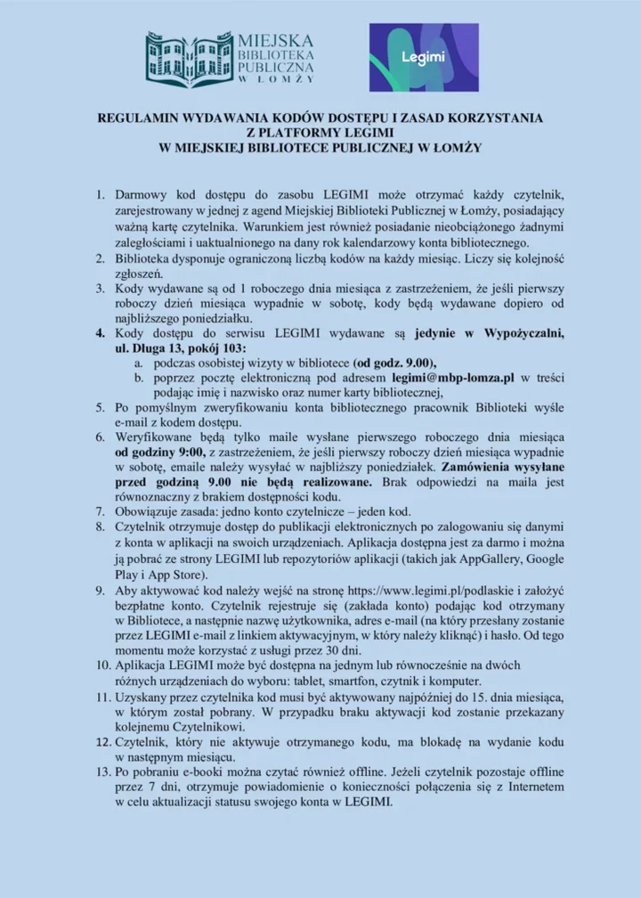 Zanim kod trafi do czytnika, dobrze zajrzeć do regulaminu wydawania kodów i korzystania z platformy Legimi, który biblioteka udostępnia na swojej stronie. To tam znajdują się zasady, o których warto pamiętać przed zgłoszeniem.